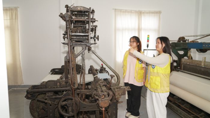壮锦馆内展品丰赡,各式纺织机具错落陈列。一面展墙系统镌刻着“宾阳织锦记忆,赓续传承之心”的壮锦发展脉络,队员们逐字品读,深入溯源壮锦制作的演进历程,深切感受其中沉淀的历史底蕴。馆内后侧静置着两架纺织机:其一为1993年的老式机具,承载着岁月的痕迹;另一架则是现代设备,彰显着技术的革新。新旧机具的并置,不仅是时光的对话,更直观呈现了纺织技艺的迭代升级与持续发展。