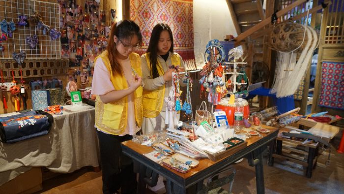 实践队首站走访宾州古城壮锦手工基地,各式工艺品映入眼帘:包袋上斑斓纹样交辉,灯光下丝线熠熠生辉,从服饰配饰到日常物件,壮锦元素尽显传统工艺魅力。