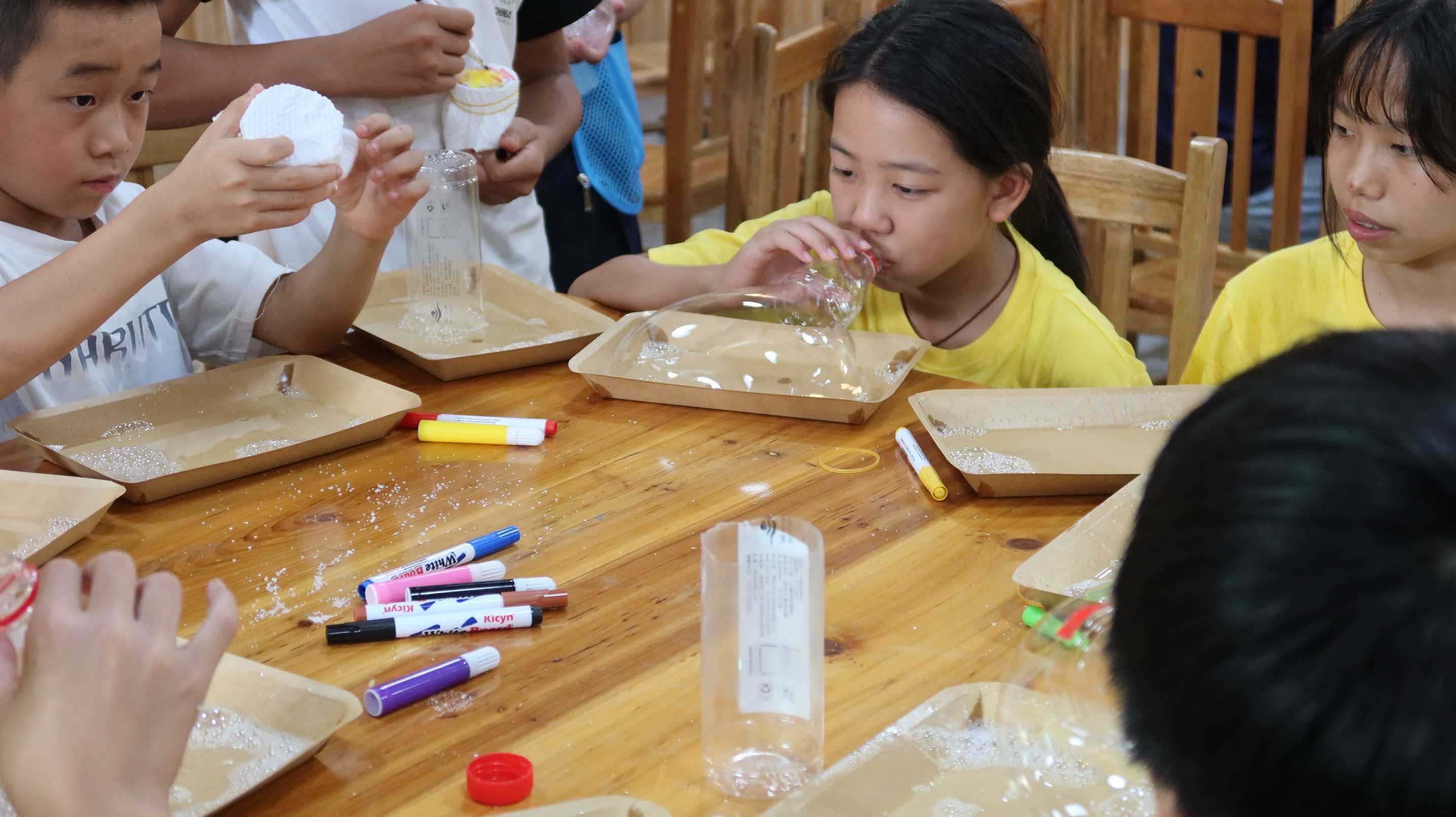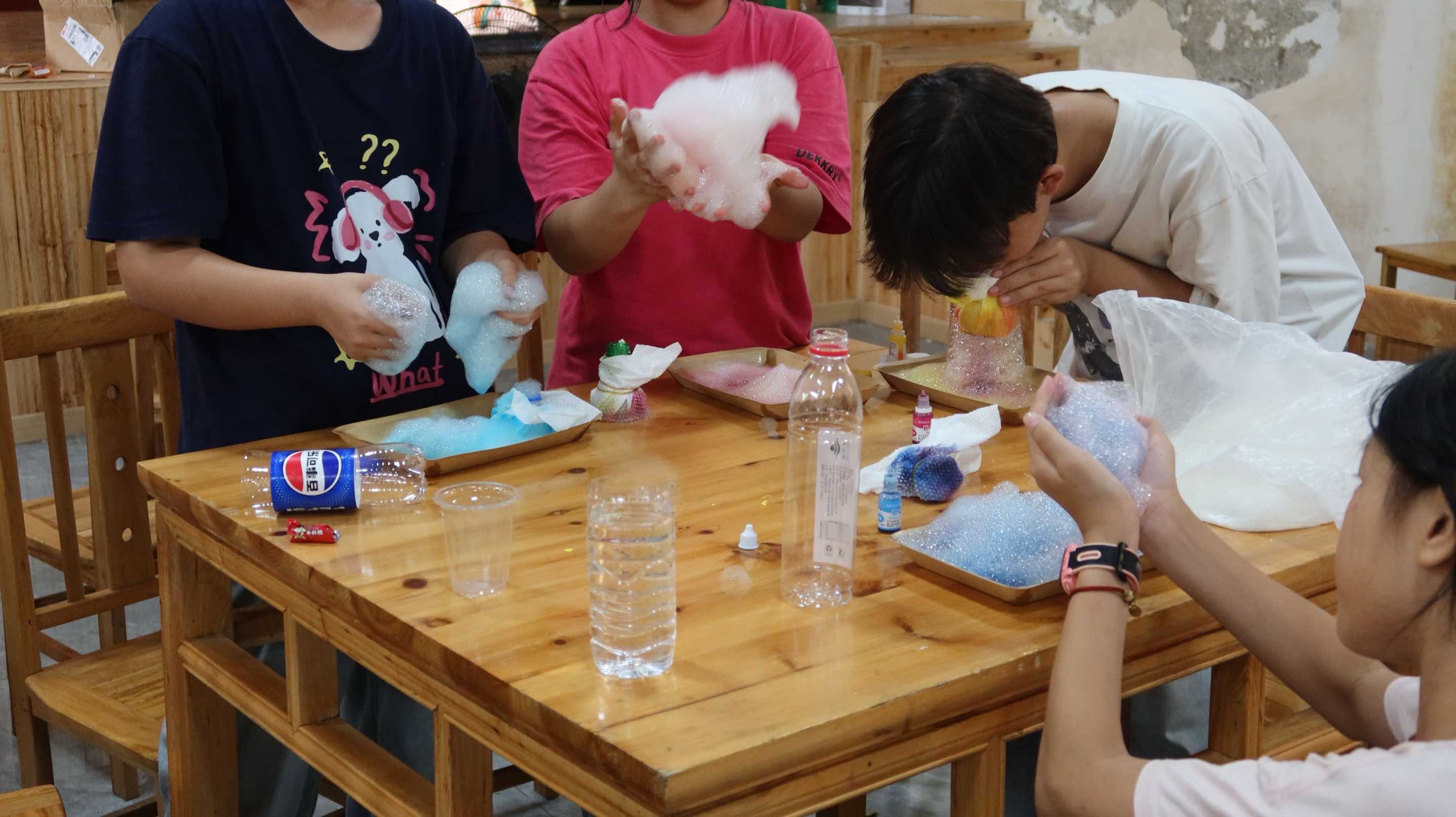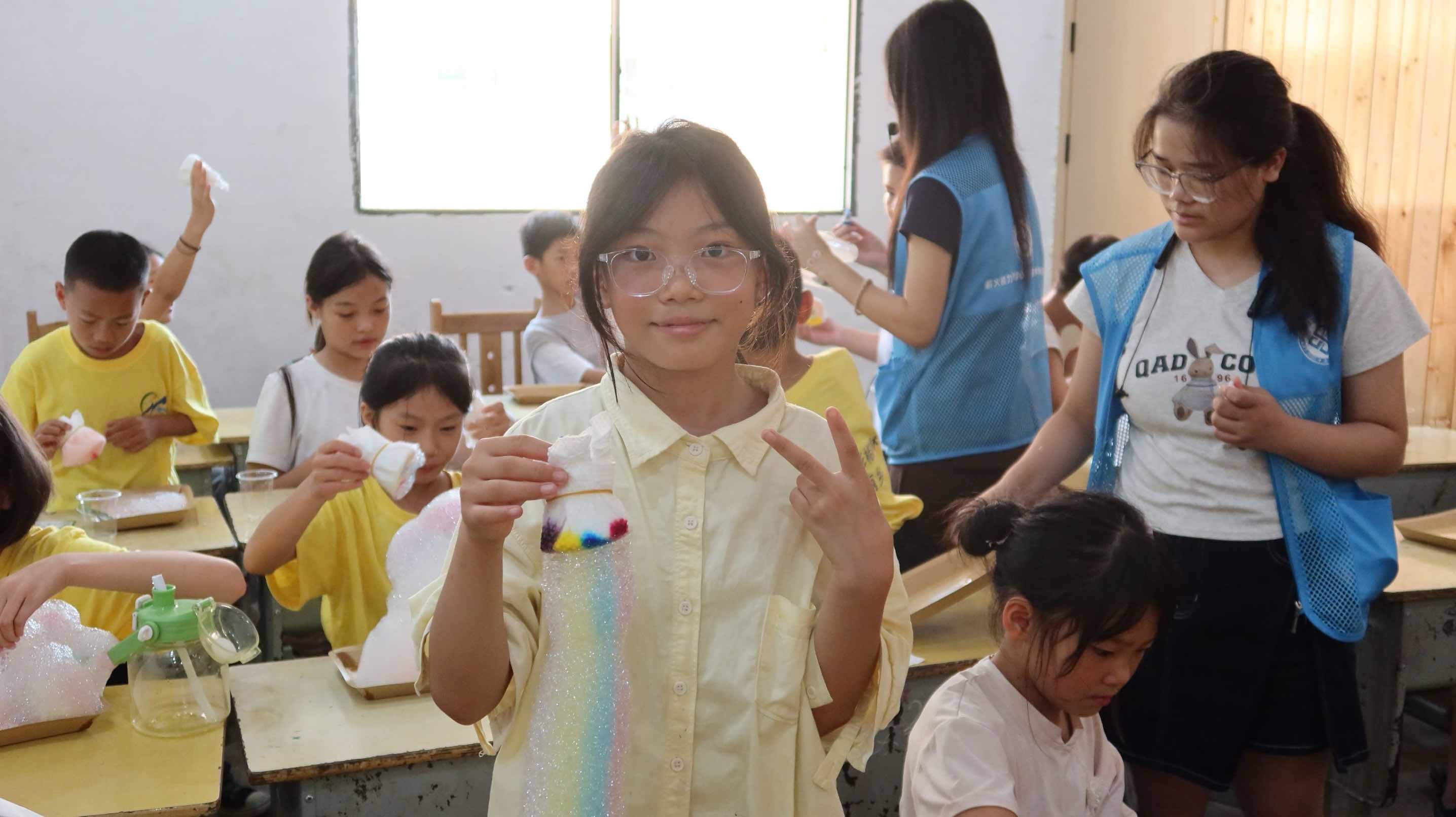 课程尾声,志愿者们把孩子们吹出的“泡泡长龙”系在窗台,阳光透射,走廊瞬间化身彩虹隧道;大家又票选出“最持久泡泡奖”。欢笑与惊叹声里,这堂别开生面的化学实验课落下圆满帷幕,但科学的种子已悄然播撒在孩子们心中。
