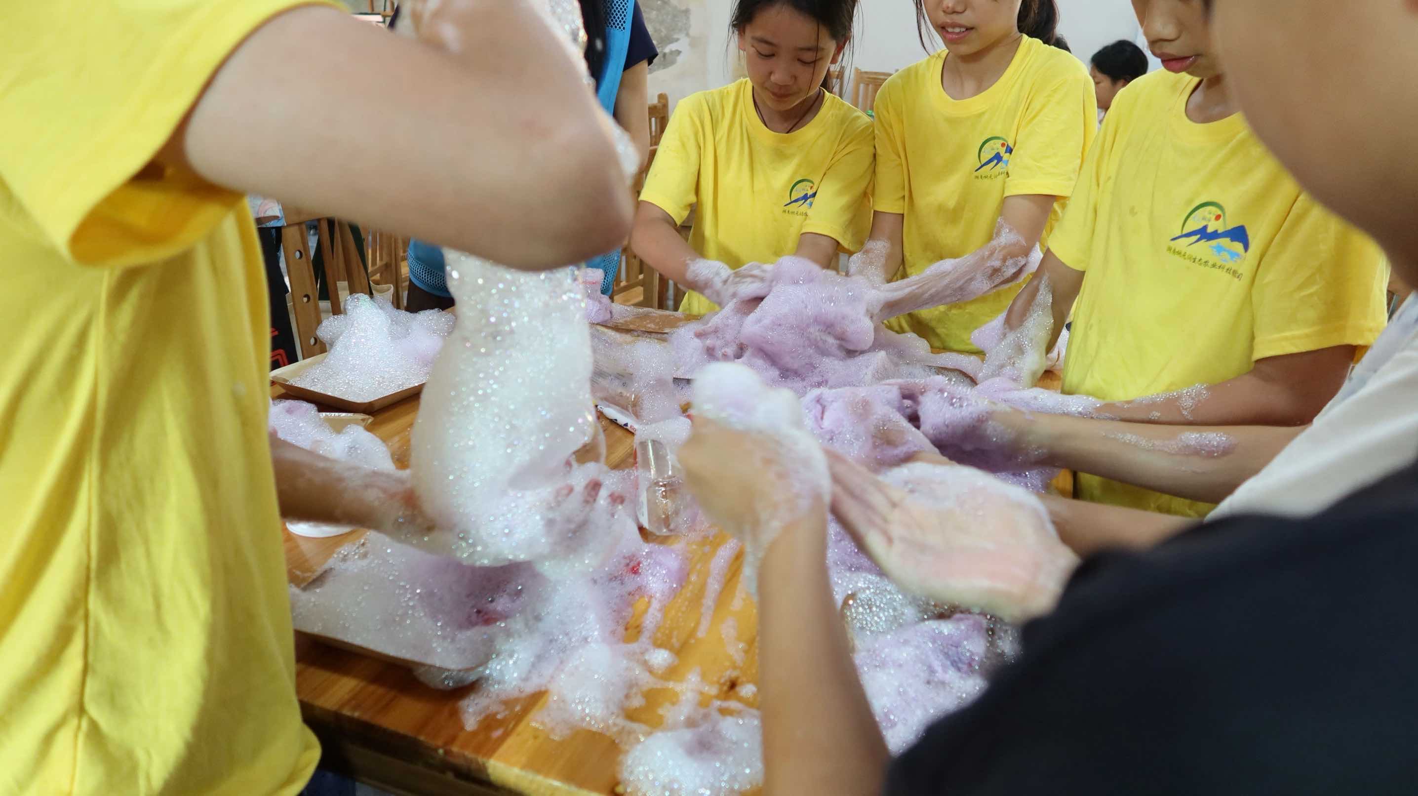 美育润心:让科学的色彩飞起来 第一节课的铃声响起,小学部和初中部的教室瞬间变成“小小实验室”。中南大学商学院椒林薪火·筑梦引航团托盘余馥含老师把托盘往讲台中央轻轻一放:三只透明量杯,分别贴着“水”“洗洁精”“糖”的标签。相比于认知中的化学实验,余老师“另辟蹊径”,不背书,也不抄方程式,只用最普通的厨房材料,想让孩子们吹出最不可思议的彩虹。大家知道后眼睛都立刻亮成一排排的小灯泡。