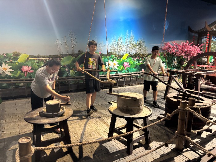 图为团队成员体验如皋当地农耕文化中重要的研磨工具石磨根据不同功能演化出的不同种类。(多彩大学生网通讯员 张升鹤摄)