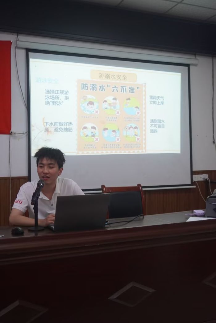 活动开场,覃江便以 “小朋友们,夏天天气很热在户外玩耍我们需要注意什么?”这一贴近生活的提问为切入点,随后围绕 “防溺水、交通安全、居家防护”三大主题展开讲解。考虑到孩子们的认知特点,团队特意设计了情景模拟环节 —— “同伴落水如何正确施救”的情景模拟,让孩子们身临其境,纷纷举手分享施救方法,现场气氛热烈。通过模拟,他们学会了冷静理智应对危险。“陌生水域我不去,红绿灯前左右看”的顺口溜搭配案例,让孩子们深刻认识到违反安全规则的后果,安全意识悄然增强。