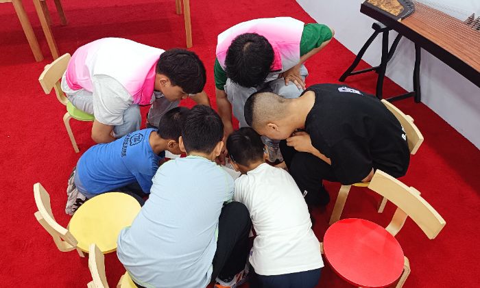 发音练习基础上,实践队成员曹瑜梵组织了“拼字大挑战”活动。色彩鲜艳、尺寸较大的拼音卡片及包含“日”、“月”、“山”、“水”、“口”、“手”、“木”、“火”等30余个高频独体字和简单合体字(如“明”、“林”)的字卡铺满活动室地垫。孩子们在队员们引导下,根据“花朵”、“太阳”、“门口”、“树林”等目标词语,或独立搜寻,或协作配合,寻找并组合相应部件。成员同步讲解字词含义,并鼓励孩子们大声朗读拼组结果。当一名儿童在实践队成员王希承辅助下成功拼出“太阳”并清晰读出时,周围同伴给予掌声鼓励。此活动锻炼了孩子们对汉字结构的初步认知和拼读能力,激发了他们对汉字的兴趣和成就感。