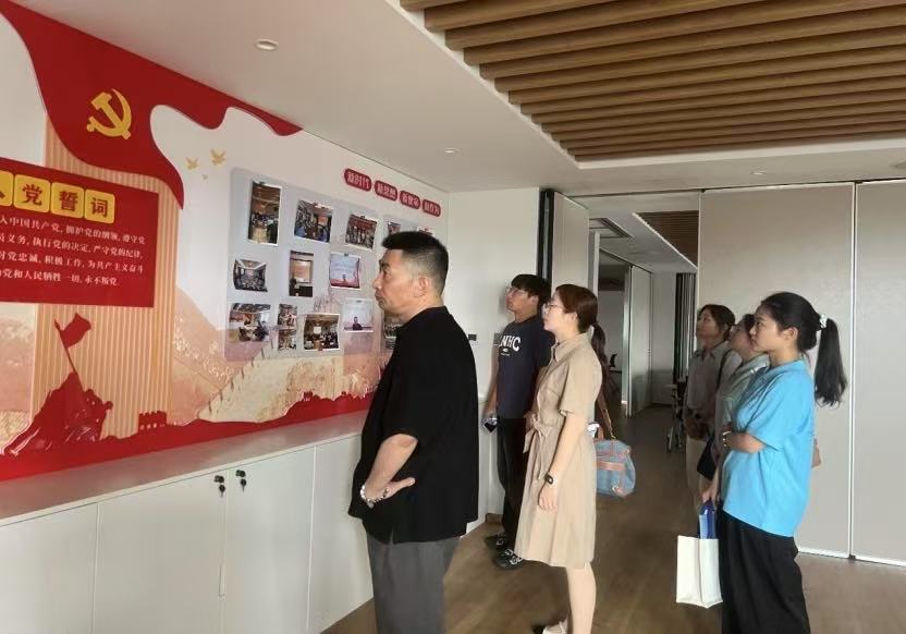 实践团队首站走进企业内部,在聆听陈昕对企业概况的简介后,依次参观企业荣誉墙、员工办公区、休息活动区与党建中心等内部区域,在陈昕的介绍下了解企业在安全交易、环保实践等方面的举措,直观理解企业社会责任落地路径。荣誉墙罗列的各类奖项,见证了企业履行责任获得的认可,其中企业的骆德龙董事长曾获得全国劳动模范荣誉称号。员工办公区里,工作节奏忙碌有序,传递出企业日常运营对责任理念的贯彻。休息活动区布置温馨,体育活动等设施齐全,体现企业对员工关怀这一社会责任维度。党建中心则揭示红色引领下,企业通过评选先进党员,设立企业妇联等,将社会责任融入发展基因的深层逻辑,让实践团队对企业责任生态有了具象认知。