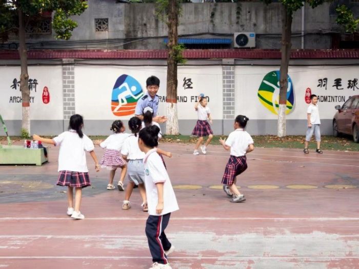 一、操场欢歌里的信任萌芽 志愿者们带领孩子们在操场上进行体育活动,扔沙包时,志愿者与孩子并肩作战,灵活闪躲、精准投掷,欢笑声惊飞枝头夏鸟;踢毽子时,志愿者们特意放慢速度,手把手教低年级孩子抬脚、屈膝,当孩子终于踢够三个时,两人击掌的瞬间,阳光恰好落在他们相握的手上;乒乓球台前,志愿者耐心传授击球要领,小球在球台来回跳跃,碰撞出默契火花。这些带着汗水的互动,让孩子们发现,穿警服的大哥哥大姐姐既能像松柏般挺拔,也能像伙伴般亲近、信任的种子就在奔跑与欢笑中悄悄扎根。