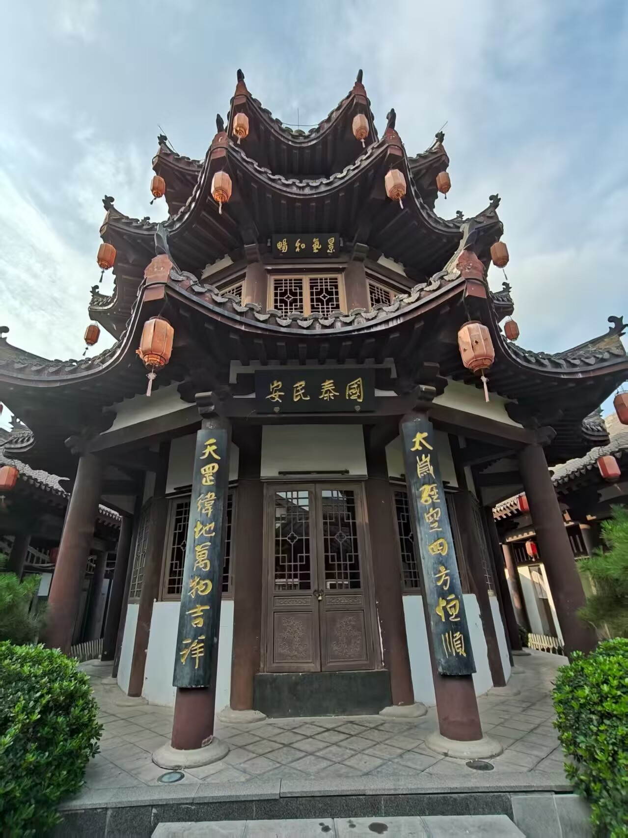 踏入隋唐大运河文化片区,首遇**“国泰民安”楼阁**。飞檐如翼,层层递升,榫卯结构的精巧在光影中尽显。梁柱间,“天罡覆地万物吉祥,太阴垂空四方恒顺”的楹联古朴厚重,墨色里藏着运河水运的千年祈愿。