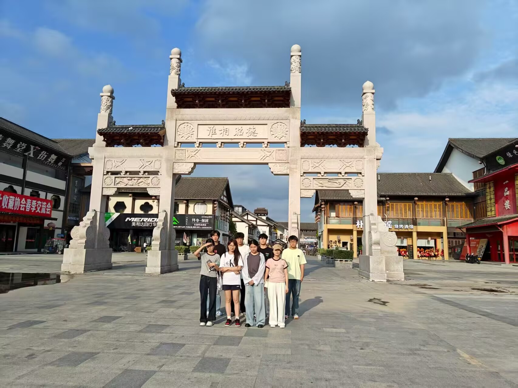 实践尾声,团队于**“淮湘昭德”石牌坊** 下定格合影。牌坊通体石砌,刻工精细,“淮湘昭德”四字刚劲,浮雕“漕运图”“商船往来”再现运河盛景。蓝天为幕,古建为凭,队员们的身影与历史遗存重叠,成为运河文化传承的青春注脚。