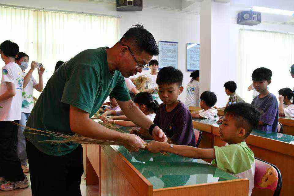 课堂上,在主讲老师对上洞村草龙舞知识的生动讲解下,孩子们热情高涨,踊跃举手提问与积极抢答。紧接着,第四代草龙非遗传承人姚锦安师傅亲临现场,向孩子们讲解上洞草龙舞的历史渊源,且通过草龙模型构造,讲解草龙编织技艺。在接下来的草龙编织实践活动中,姚师傅手把手耐心指导孩子们编织构成草龙本体的稻草辫子;队员们有效组织、带领孩子们在动手实践中感受非遗魅力。
