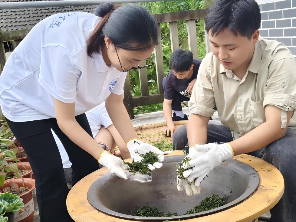 采摘结束后,团队转战炒制区。高级制茶师朱师傅现场演示了杀青,揉捻,干燥的核心工艺。铁锅温度的精准把控,翻炒时的利落手法、揉捻时的力度和方向都有微妙讲究,一步不到位就要推翻重来,一步不到位就会影响茶叶口感,可谓之“失之毫厘,谬以千里”。紧接着成员们轮番戴上手套亲自实操,感受鲜叶在高温与手法的作用下蜷缩成茶的奇妙过程,更深刻体会到:一盏香茗的背后,是工艺的代代传承与无数次的反复打磨。