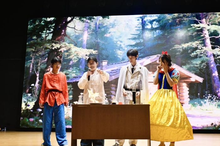 随后,由大学生演绎《白雪公主与小高人》。“巫婆”捏着嗓子,举着“永葆青春果”一步步逼近“白雪公主”,台下孩子们紧张地皱起了眉头;“小高人”发现昏迷的公主后,灵机一动用白醋和小苏打产生的泡沫唤醒了她,举着杯子展示的时候,前排的孩子都纷纷伸长脖子,想要看得更清楚;“小高人”用维生素C破解“巫婆”说淀粉遇碘酒变蓝的“黑魔法”,溶液褪色的那一刻,全场响起一片欢呼;“王子”演示“七彩火焰”,当火焰变幻出绚丽色彩时,孩子们发出阵阵惊叹,有的还兴奋地拍起了手。剧情中每当有“魔法”出现,就会有万能的“小博士”现身讲解。“小博士”的讲解在孩子们心中悄悄埋下了对科学好奇的种子。