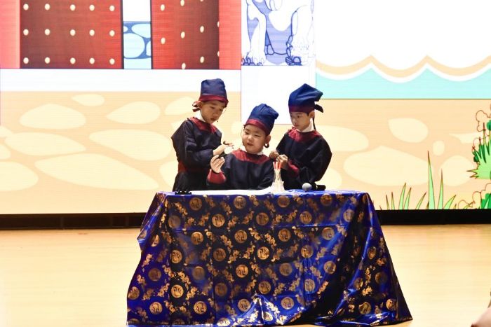 舞台上,小学生们化身《水滴石穿》中的角色,生动还原了故事里的各个场景。课堂上,扮演“妹妹”“姐姐”的两位小演员你一言我一语地聊起“水滴石穿”的成语;转场到古代场景,“府库小吏”偷偷将一枚铜钱藏进帽子,那鬼鬼祟祟的模样逗笑全场。