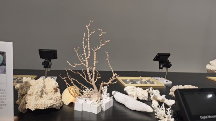 新生主题区,顾名思义是赋予珊瑚新的生命。展览中的作品《生生》,通过在珊瑚上接入管子和球,生动地展现了珊瑚向上生长的蓬勃生命力。展区内还展示了3D打印的人工礁体,讲解员向队员们详细介绍了珊瑚的人工种植技术。让队员们惊讶的是,珊瑚在人工礁体上的固定方式竟是采用水泥,讲解员进一步说明,人工种植的珊瑚在水泥固定段会死亡,但水泥上方的珊瑚仍能继续生长。而且珊瑚种植后会有专属编号,后续种植员会定期检测其生长状态。此外,讲解员还介绍了另一种人工种植方式——原位种植。