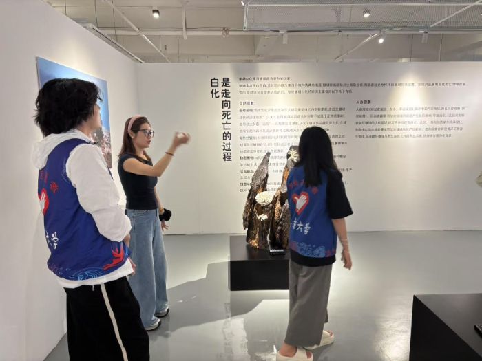 (图为三亚珊瑚研究所讲解员向海南自贸港海洋生态守护实践团队员讲解珊瑚礁海洋生态艺术展白化主题区作品。黄紫艳 摄)