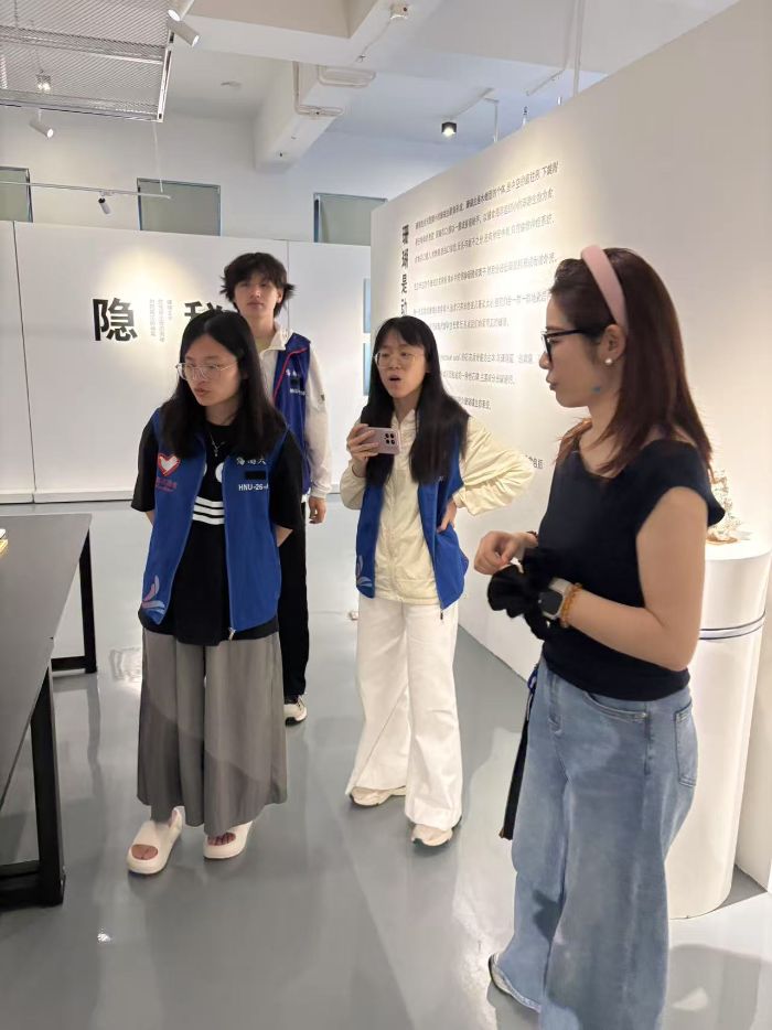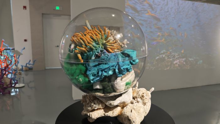 随后,队员们参观了珊瑚礁海洋生态艺术展,展览围绕绚丽、白化、新生、隐秘四个主题展开,每一个主题都引人入胜。在绚丽主题区,各类雕塑作品将珊瑚的美展现得淋漓尽致,其中一件采用布衣扎染与珊瑚结合的作品,巧妙地构建出一个微妙而梦幻的海底世界。值得注意的是,展览中出现的珊瑚均为白化珊瑚,有队员提到曾在海滩捡到过白化珊瑚,讲解员随即解释:“在海南,珊瑚出岛是受限制的,在海滩旁捡到珊瑚只要不带出海南,是没有问题的。”随着讲解员的深入讲解,各个作品所蕴含的美以及背后的创作理念逐渐清晰地呈现在大家眼前。
