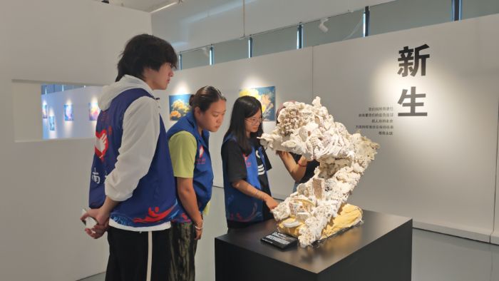 (图为海南自贸港海洋生态守护实践团队员观察珊瑚礁海洋生态艺术展新生主题区作品。黄紫艳 摄)