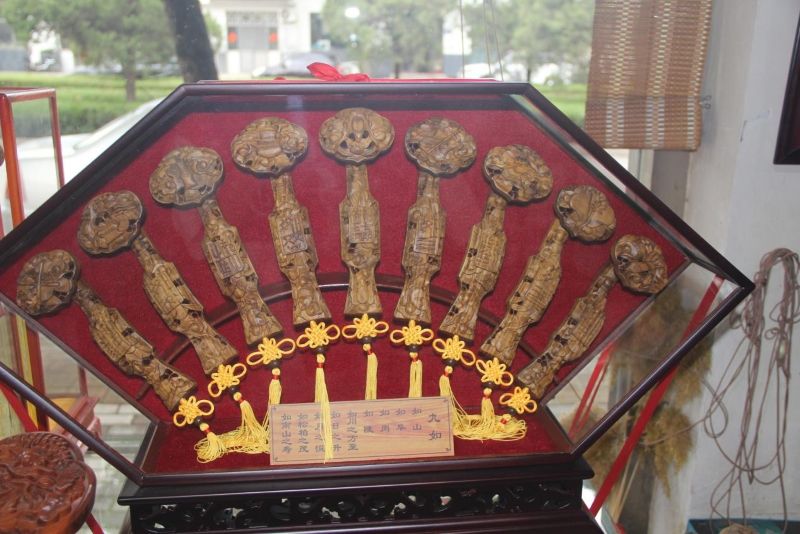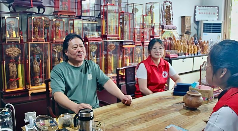(一)疏影穿城寻古意,刀痕落木见匠心7月21日,阳光透过树的枝叶,树影斑驳。队伍穿过古城,到达省级楷木雕刻非遗传承人——褚德胜老师的工作室。在这间古朴的工作室里,木屑簌簌落下,褚德胜老师正手持刻刀,在一块温润的楷木上细细雕琢。作为省级非物质文化遗产楷木雕刻的代表性传承人,他与楷木为伴四十余载,用刀痕记录着这项传统技艺的千年故事。除此之外,工作室内还陈列着近数百座楷雕作品,或大或小,每一个都精美如画,其精细程度更是令人惊叹。