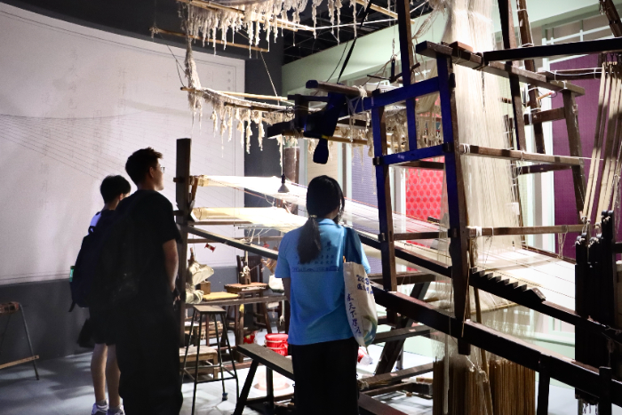 宋锦作为中国三大名锦之一,拥有千年历史传承,是国家级非物质文化遗产代表。在园区讲解人员引导下,调研团系统了解了宋锦织造的工艺演变与设备革新,从传统手工梭织工艺到当前部分织造环节中采用的智能辅助系统,展现出“非遗制造”在数智融合背景下的适应探索。现场展示区域呈现了传统图案复原、织造流程再现及智能织机演示,反映出文化传承与工艺革新间的互动进程。
