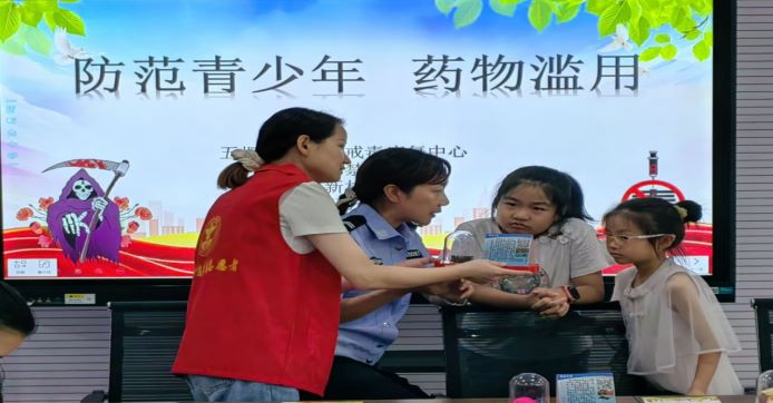 禁毒办工作人员带来海洛因、冰毒、摇头丸等仿真毒品模型,以及伪装成零食、文具的新型毒品样品,邀请社会实践队队员与现场小朋友近距离观察辨认。“这个长得像糖果的东西,其实是毒品!”孩子们在工作人员的引导下,仔细观察模型,踊跃提问。禁毒办人员结合模型特性,深入浅出地讲解毒品识别要点,让抽象的禁毒知识变得直观可感。