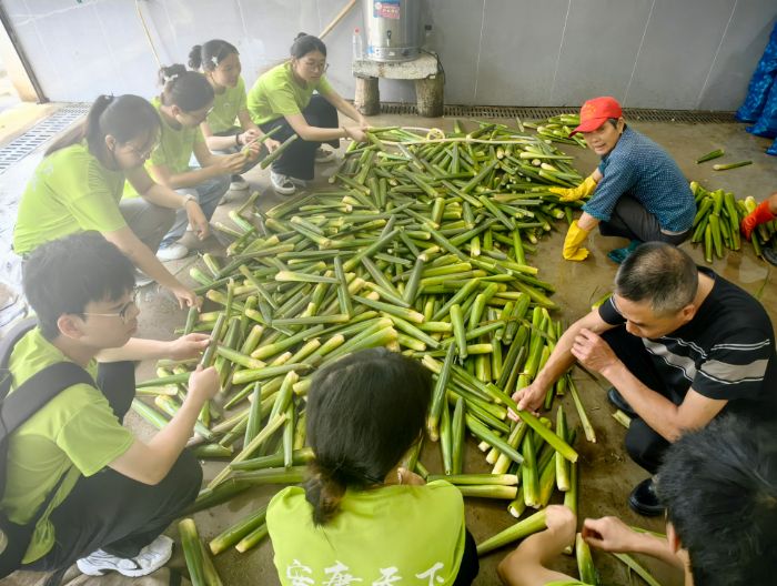 实践团深入梨山村茭白种植基地,实地探访产业转型成效,成员随基地负责人易叔叔走进田间,听其细数产业变迁:“以前种水稻,农户仅能自给自足;改种茭白后,依托‘合作社+农户’模式及水旱轮作、绿色防控等技术,每亩收益已突破8000元。” 在葱郁的茭白田间,团队成员围绕种植技术与病虫害防治等环节展开深入交流。为直观展示生长差异,负责人易叔叔特意采摘了处于不同发育阶段的茭白样本进行对比讲解,队员们俯身细察、不时交流;团队成员胡博卿和朱魏斌现场品尝新采收的茭白,切身感受作物品质。谈及产业带动作用,易叔叔望着连片茭白田感慨道:“村里老人闲时来帮忙打包茭白,也算为村庄发展出了力。”但提到运输难题,他眉头微蹙:“山区交通不便,好东西运出去难,这是目前发展的一大瓶颈。”