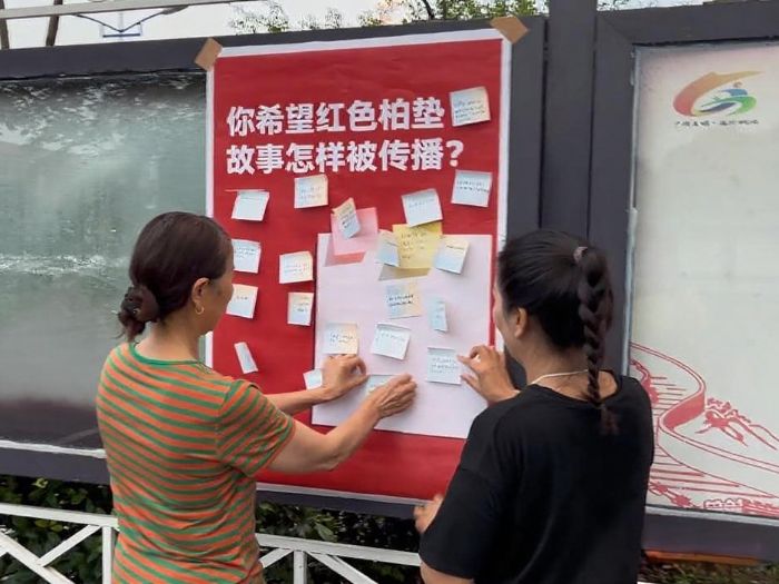 在深入探访红色历史、助力乡村产业发展的基础上,实践团成员进一步聚焦红色文化的传播与活化工作。海报以醒目的红色为主色调,融合柏垫镇革命历史元素,以“你希望红色柏垫故事怎样被传播”的问题,面向群众收集对红色文化传播形式的偏好和建议。活动现场,不少居民起初驻足观望、心生好奇。团队成员主动上前热情邀请,引导大家填写意见与想法;互动过程中,团队同步了解了柏垫红色资源的开发现状与传播痛点。通过这次调研,搭建了一个简易的平台让居民表达对红色文化传播的看法,真实反映了柏垫民众对柏垫的了解与认知。