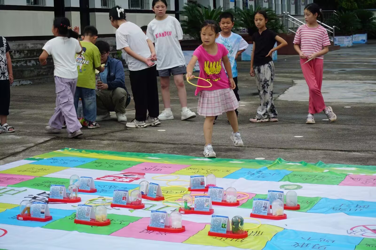 互动体验:寓教于乐强实践 室外活动以趣味游戏筑牢防毒技能。“火眼金睛套圈赛”将毒品模型混入日常物品,训练学生识别伪装毒品能力;“知识抢答”环节则激发主动思考,答对者获禁毒主题纪念品。寓教于乐的设计让防毒意识在实践中生根,在收获乐趣的同时,也让学生们深化了对毒品造成危害方面的认知。