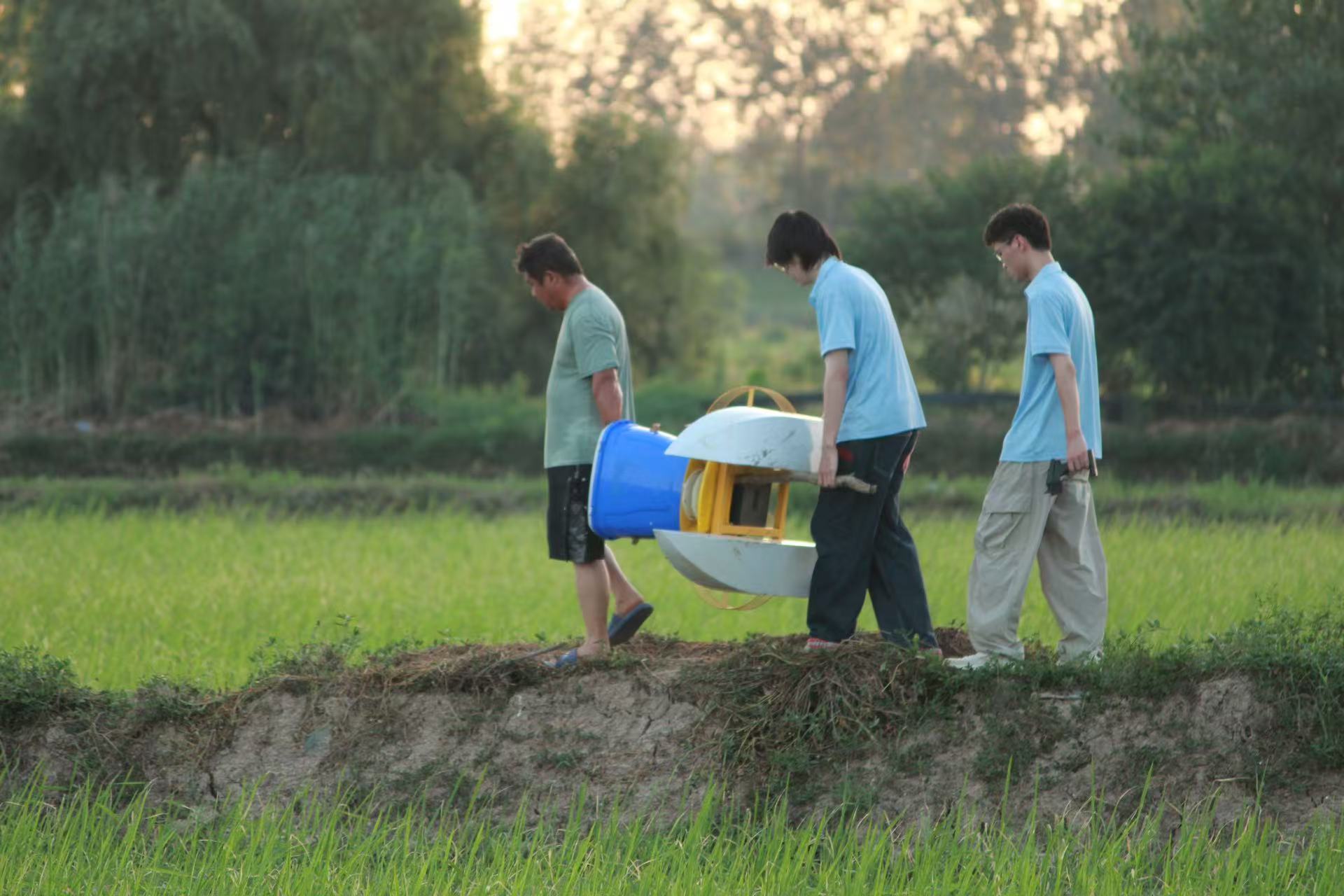 下午,稻田里传来阵阵的电机声,一台身形小巧、配备摄像头和传感器的无人艇,灵活穿梭于田间沟渠与灌溉水域。实践团正用它做下田试验。