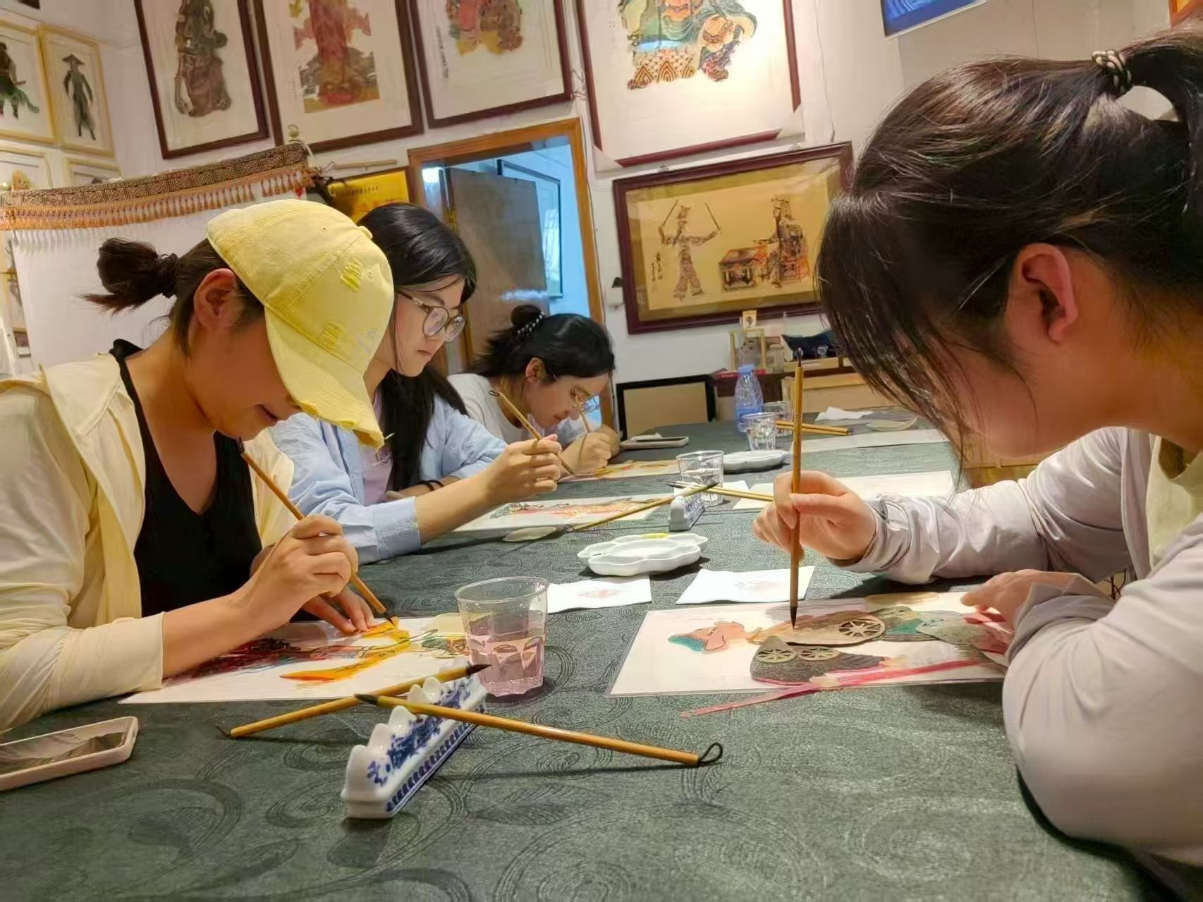 皮影戏,这门始于西汉的“光影魔术”,其制作凝聚着世代匠人的心血。在工作室,老师傅系统展示了从制皮、画稿到最终缀结的十余道繁复工序。本次体验聚焦敷彩与缀结两大核心环节。首先是敷彩环节,实践团成员屏息凝神,执特制笔刷蘸取天然矿物、植物颜料,在刻好的皮影部件上小心晕染。色彩浓淡过渡、层次叠加渲染,不仅考验耐心,更需精准把握“火候”,一笔不慎即影响神韵。其次是缀结环节,如何精准定位连接点、选用合适丝线、控制关节松紧?老师傅的指导揭示了让影人“活”起来的学问。当团队成员亲手将部件以细线串联,看着平面的皮影在指尖“站立”起来,成为可操控的灵动影人时,那份成就与对古老智慧的敬畏油然而生。专注的镂刻、细腻的敷彩、精巧的缀结——每一步都需倾注全神。成员们真切触摸到:一个栩栩如生的皮影背后,是匠人无数次精雕细琢的时光沉淀。指尖划过温润皮料与冰凉刻刀,感受到的却是千年文化脉动与沉甸甸的传承使命。