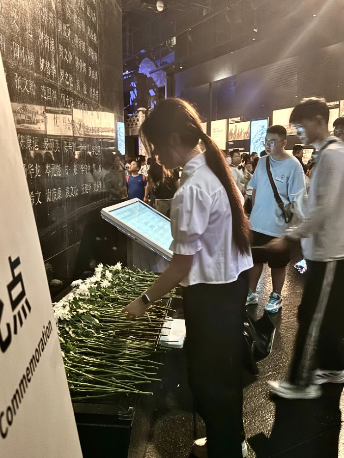团队在“幸存者证言墙”注意到一位女性幸存者的口述内容。她回忆,年幼时母亲为保护邻家孩童,不幸在日军暴行中遇难。这一历史片段无声地诉说着女性在战争中的双重角色:她们是暴行最直接的受害者,同时也是保护弱小、维系生命延续的抗争者。参观结束前,团队全体成员在纪念馆祭场举行了简短仪式,向遇难同胞敬献花束并肃立默哀,表达对历史的铭记与对人道精神的致敬。