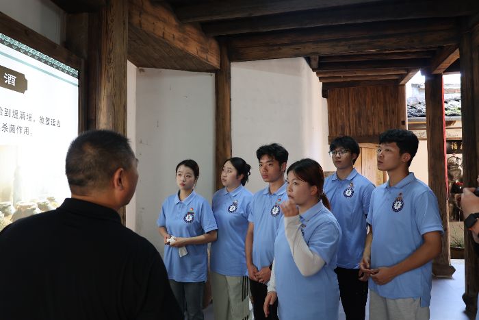 在传统黄酒酿造作坊,队员们开启了对传统工艺的探索。此次北墘村社会实践活动联系人、黄酒酿造传承人吴善寨向队员们介绍黄酒酿造的悠久历史和独特工艺,从原料的精选,到浸泡、蒸煮、发酵,再到最后的压榨、陈酿,每一个环节都蕴含着古人的智慧与匠心。队员们认真聆听,仔细观察,不时提出心中的疑问。