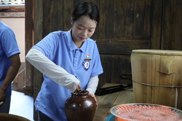 队员们在吴善寨指导下进行糯米浸泡、蒸煮,观察发酵过程中的变化。同时,通过线上直播方式,让更多人了解传统黄酒酿造工艺和黄酒文化,以新媒体助力非遗技艺传播。