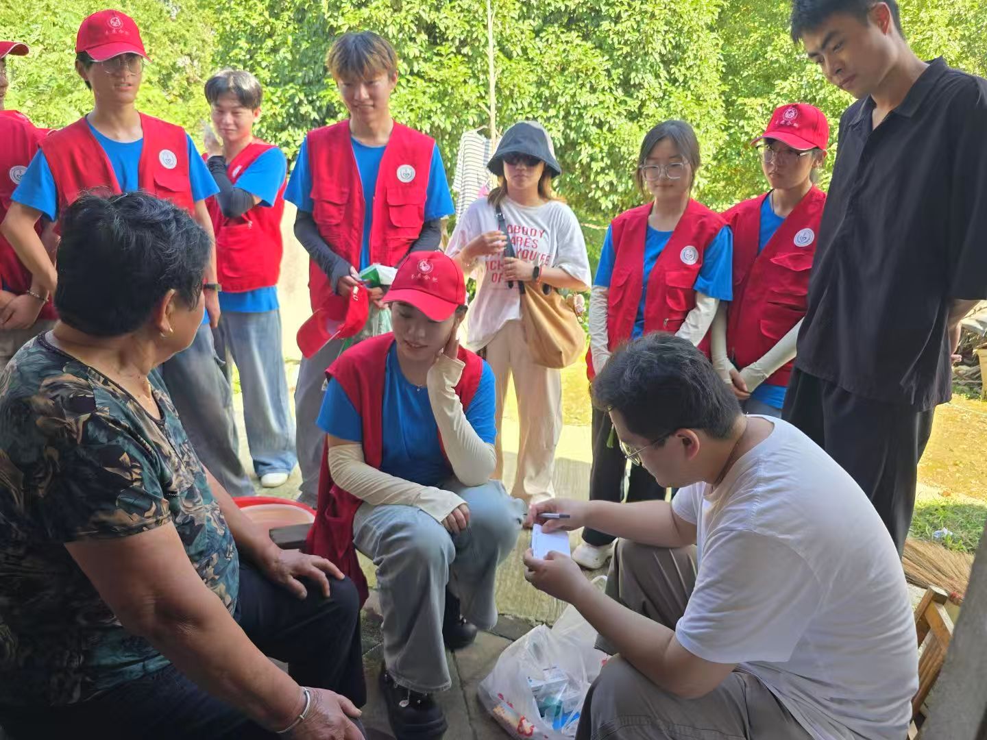 图为实践团队指导老师带领实践团队成员们认真科普,与村民们互动问答。曹相 供图