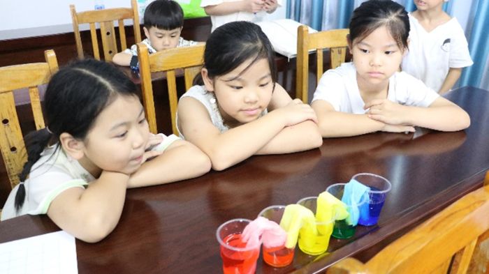 图1孩子们屏息凝神观看彩虹桥实验(微光筑梦实践团摄)
