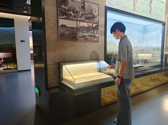 跟随讲解,团队走进小井庄纪念馆。陈列柜里,泛黄的《肥西县小井庄生产队包产到户责任制契约》尤为醒目,红手印虽历经岁月,却依旧力透纸背——这是农民求生存、求发展的朴素决心。墙上照片中,当年村民围坐讨论包产到户的场景,让成员们直观触摸到历史的温度。“原来‘敢为天下先’不是一句口号,是老百姓攥紧锄头、赌上生计的勇敢!”团队成员朱文涛盯着照片,轻声感慨。