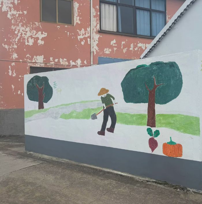 实践团抵达乡村后,迅速与村里孩童打成一片。大家手持颜料画笔,围绕“春种”“秋收”主题,在乡村闲置墙面上开启创作。绘制“春种”画面时,孩子们仔细描摹农夫耕地的姿态,志愿者在旁启发:“就像播下种子要精心照料,垃圾分类投放,也是给环境‘耕地施肥’。”画“秋收”场景,金黄麦浪、饱满作物跃然墙上,志愿者顺势引导:“收获的不仅是粮食,做好分类,乡村收获的是整洁与美好。”一笔一画间,环保与农作的联结,悄然在孩子心中扎根。