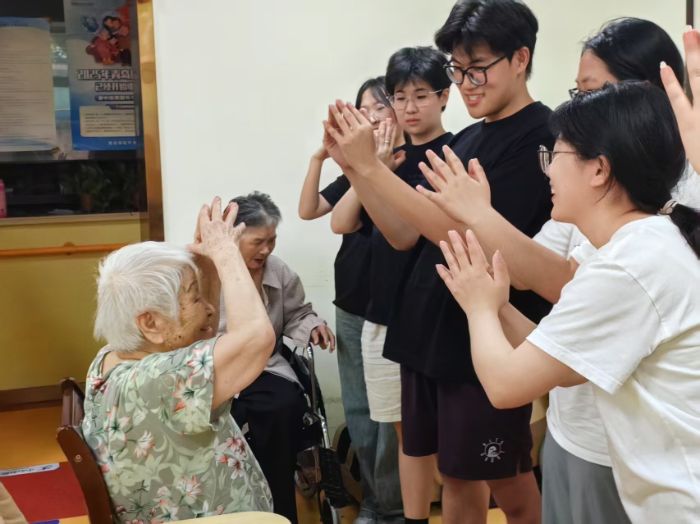 志愿者们主动走到老人身边,或陪老人做简单的手指操,耐心地教、慢慢地做,一老一少的手交叠,传递着无声的关怀;或尝试教老人使用手机简单功能,“奶奶,这样点一下,就能和家人视频啦”,帮助老人架起与外界沟通的桥梁。更多时候,志愿者们单纯陪坐聊天,听老人唠叨生活琐事,分享自己在校园里的趣事。一位志愿者握着老人布满皱纹的手,跟着老人的节奏做手势,老人脸上绽放的笑容,成为活动最美的印记。还有志愿者和老人同框拍手,定格下这温馨瞬间,相机记录的不仅是画面,更是青春与暮年碰撞出的美好火花。