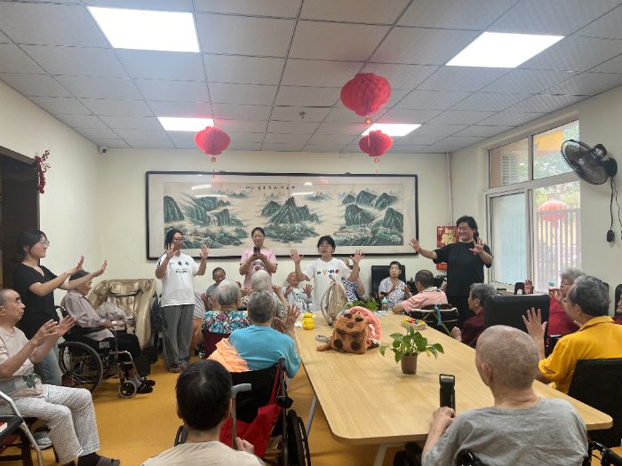 护理院活动室内,红灯笼点缀,山水画添韵,温馨氛围已就位。志愿队的文艺表演正式拉开帷幕,青春旋律与温暖故事在此交织。志愿者们组队合唱经典红歌,《我和我的祖国》的旋律响起,熟悉的曲调瞬间牵动老人的心。他们或轻声跟唱,或打着节拍,眼神里满是对岁月、对祖国的深情。