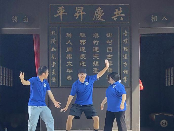 实践团成员在馆内兴致勃勃地进行了傩戏动作初体验。在学习“三蹬步”“开山式”“踩八卦”等基础动作时,成员们跟随教学视频认真模仿,很快便体会到表演的不易——沉稳步伐带来的腿部颤抖、遒劲挥臂引发的臂膀酸痛,以及精准方位转换所需的控制力,短短几分钟的练习,就让不少人额头沁汗,深刻感受到傩戏演员对肢体力量与技巧的严苛要求。