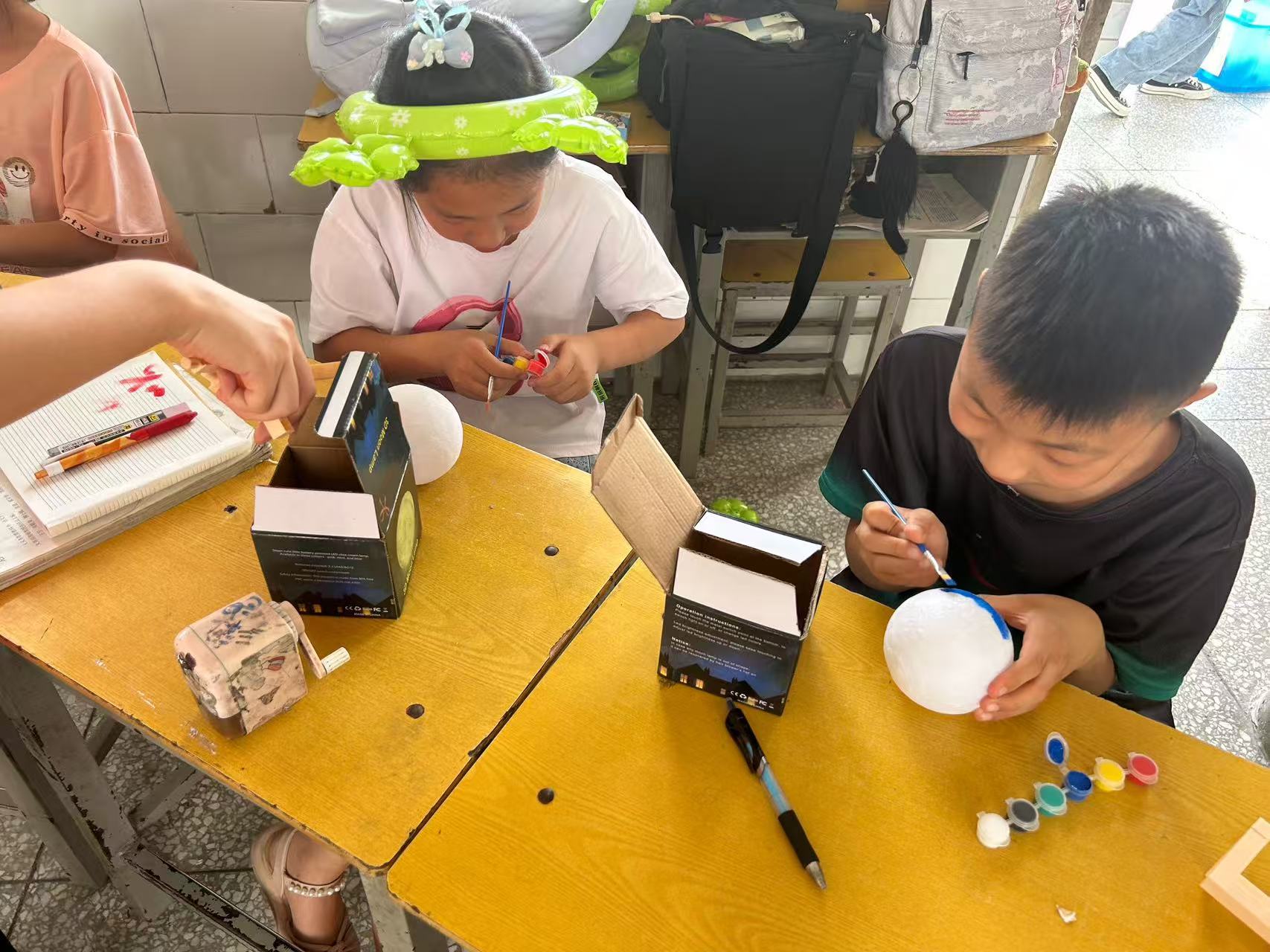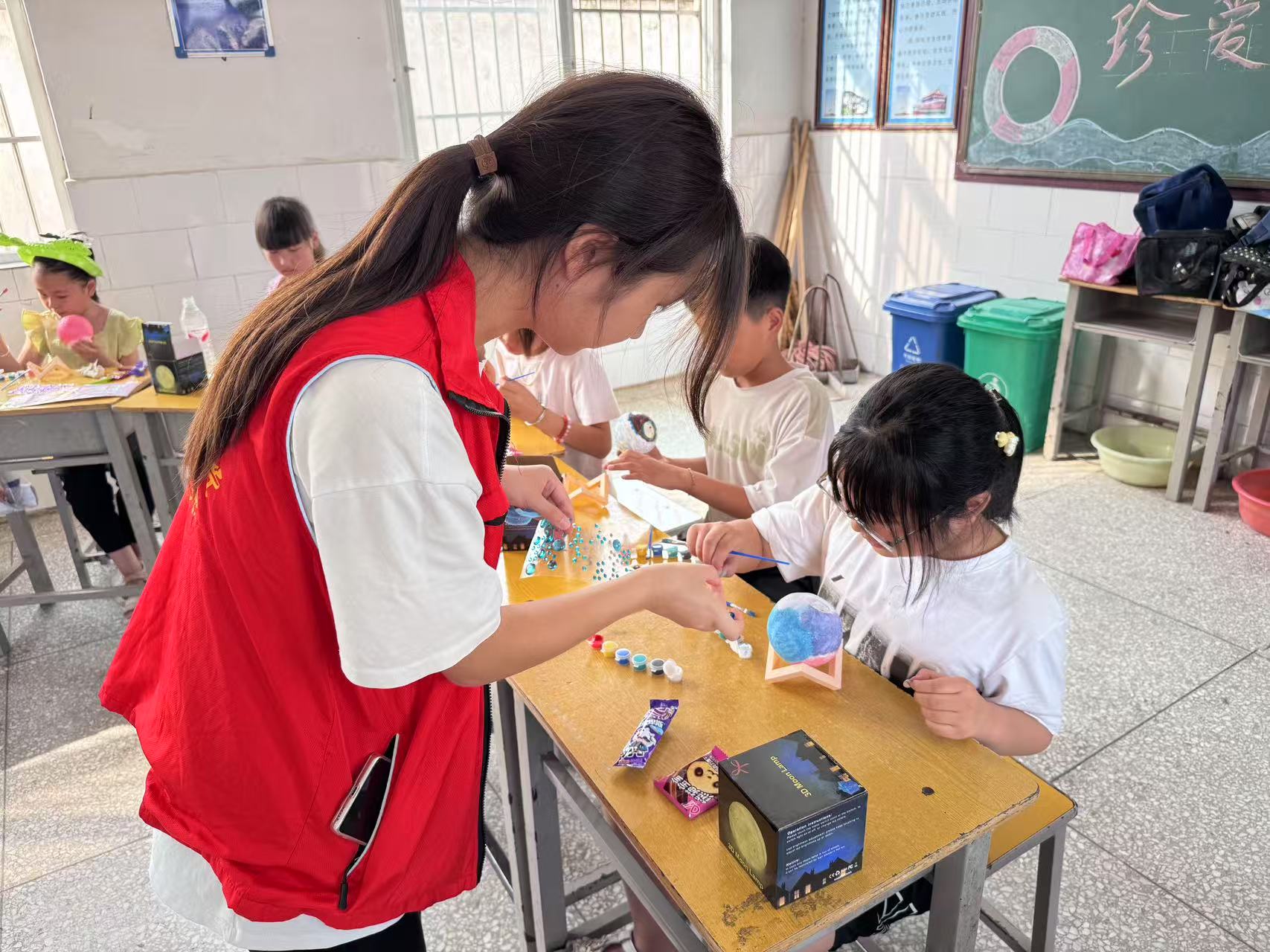 活动伊始,志愿者们精心准备了妙趣横生的手工绘画课程。课堂上,孩子们热情高涨,在志愿者的耐心指导下,拿起画笔,在空白的球体模型上尽情挥洒创意,描绘出一幅幅色彩斑斓、充满想象力的图案。有的孩子画出了心中的美丽家园,有的则描绘出浩瀚神秘的星空。每一件作品都展现着孩子们对生活的热爱和对未来的憧憬。