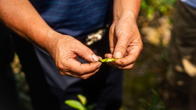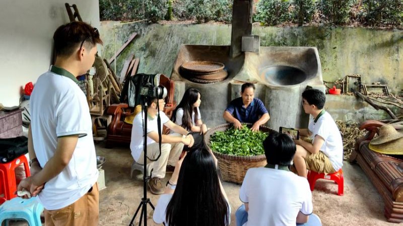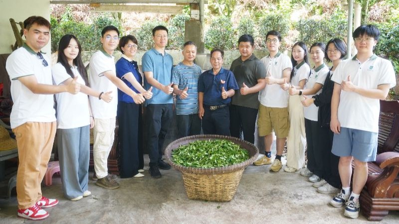 7月16日上午,实践团前往金桔村双鹰顶生态茶园。该茶园因地处抗日英雄命名的山体区域,所产桔塱茶具有独特品质。实践团现场观察了茶叶种植环境及“杀青抖散”“搓茶成条”等传统制作工艺,通过访谈了解到桔塱茶早年通过港澳务工人员作为伴手礼传播,在粤港澳地区积累了一定知名度。调研中发现,当前桔塱茶产业面临种植模式零散、年轻传承人短缺等发展瓶颈,实践团结合调研情况,为其提出了“炒茶体验课”等促进技艺传播与人气聚集的建议。