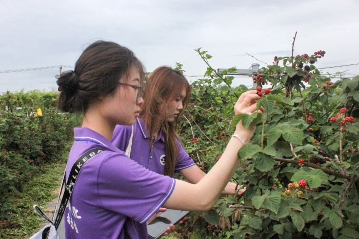 图为“莓香百汇,青力兴乡”团队成员们体验采摘黑莓。沈彦供图