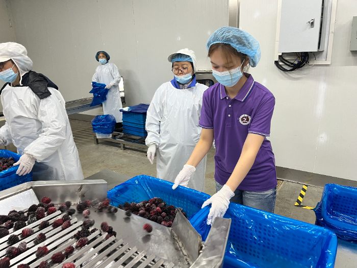 图为“莓香百汇,青力兴乡”团队成员郭歌在清洗车间体验分装工作。沈彦供图