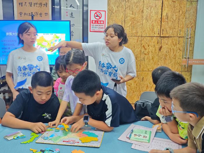 图为志愿者指导小朋友进行地图拼图。梁玉婷供图