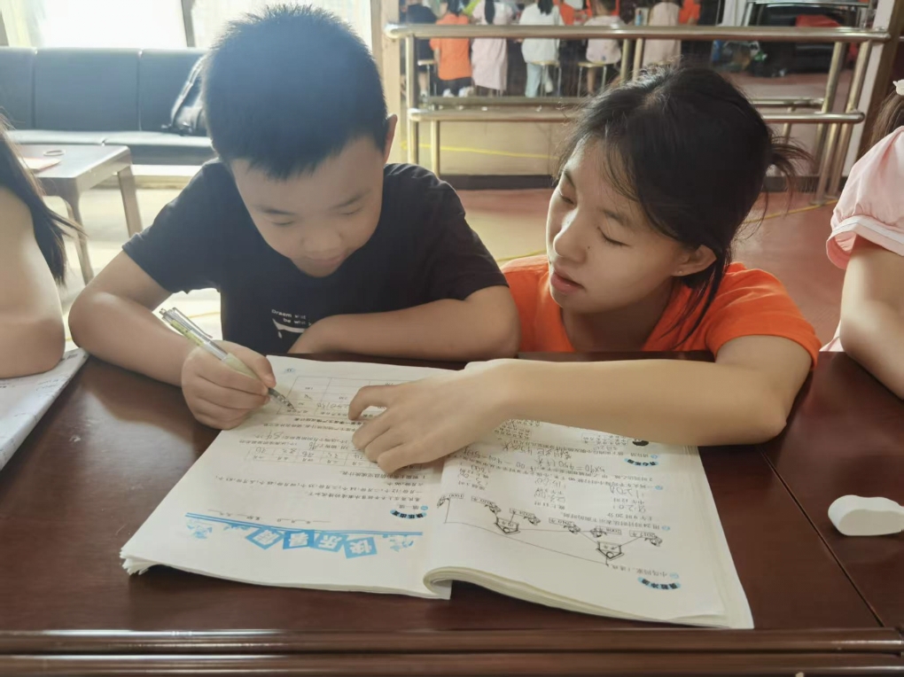 图为志愿者为小朋友进行作业辅导。 何艳飘/摄