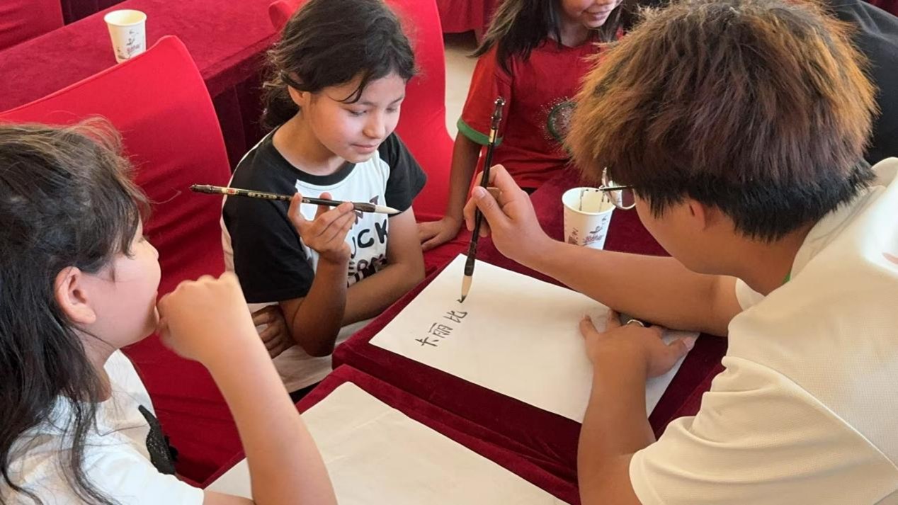 团队开设“推普助力振兴”村民课堂,针对当地村民国家通用语言文字应用薄弱环节,对70余名村民开展国语言普及;儿童书法课上,团队成员以“爱国”、“石榴”“团结”、“自己的名字”等词汇为范本,指导孩子们书写毛笔字。8岁的阿卜杜拉·艾力自豪地举起写有自己名字的宣纸:“我要把‘中国’两个字贴在家里!”