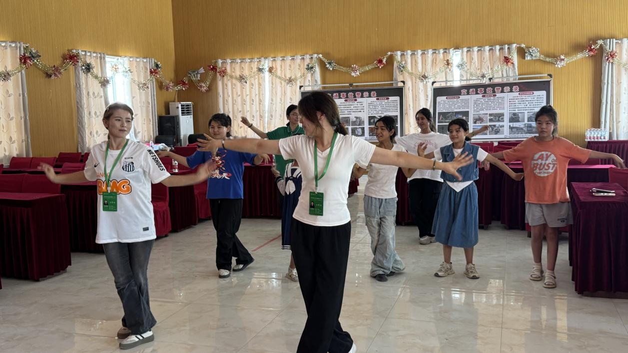 民族舞蹈:吐尔阿尔·巴哈哈别克等哈萨克族队员教孩子们跳起哈萨克舞蹈,孩子们踮脚模拟采撷动作,袖摆翻飞如绽放花瓣;接着带领孩子们体验冬不拉等名族乐器,孩子们轮流拨动琴弦,现场其乐融融。团队副队长谈琪则带领孩子们一起剪纸,传承非遗文化。