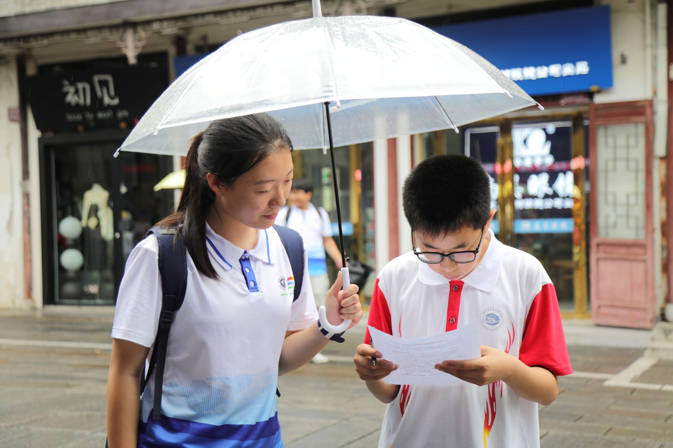 图为实践团成员向社区居民中青少年群体进行调研问卷的场景。李文慧摄