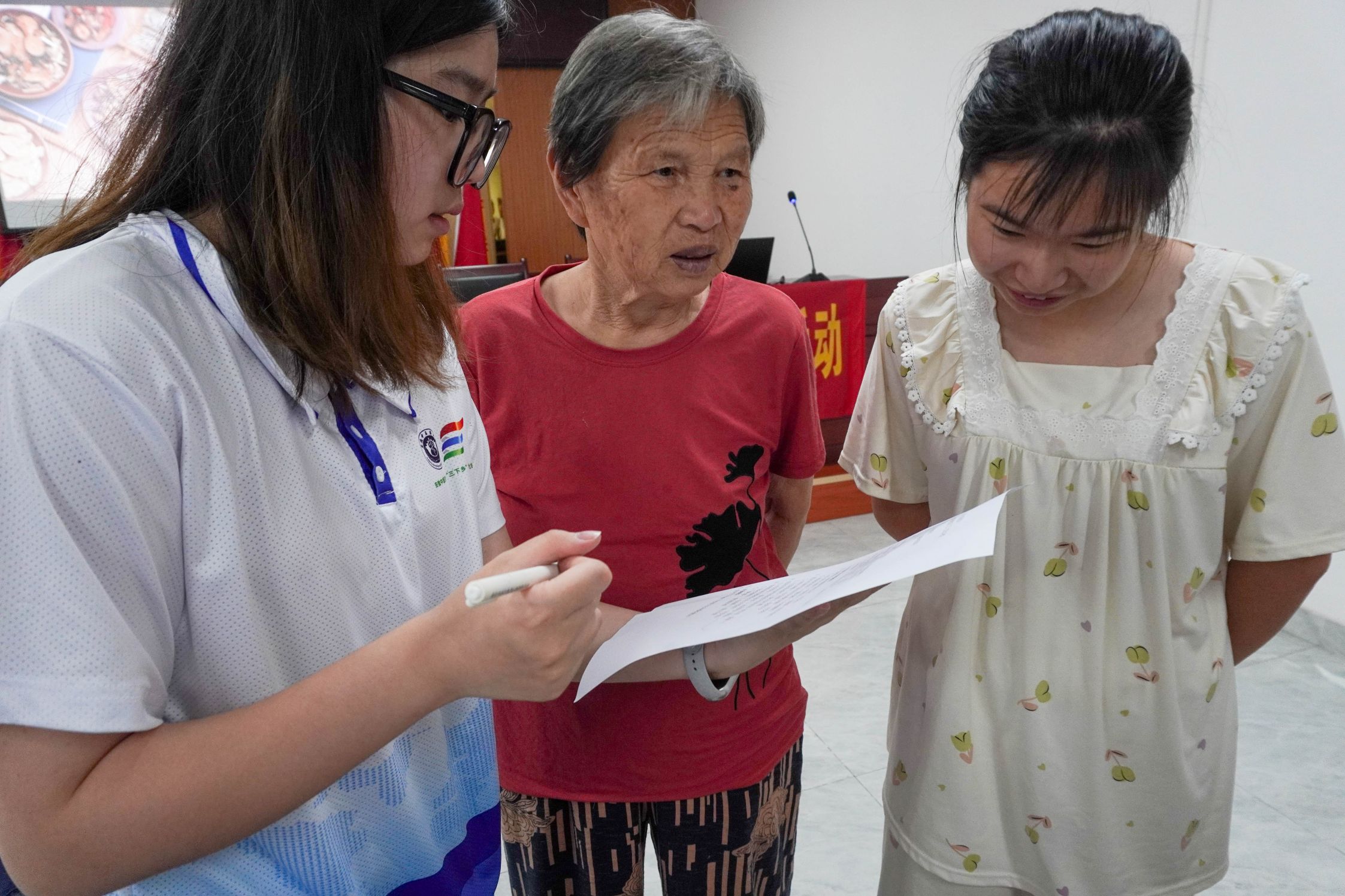 图为实践团成员为社区居民讲解调研问卷内容场景。朱雯君摄
