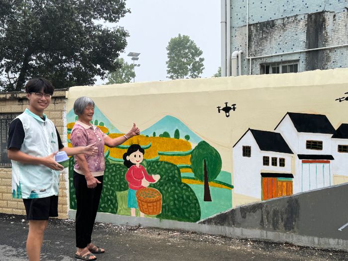 墙绘创作过程中,队员们的付出得到了当地村民的认可与支持。乡亲们时常驻足观赏,为画作点赞,还主动送来瓜果表达心意。这种双向的温暖互动,让艺术创作成为连接学子与村民的纽带,同心共建美好家园。