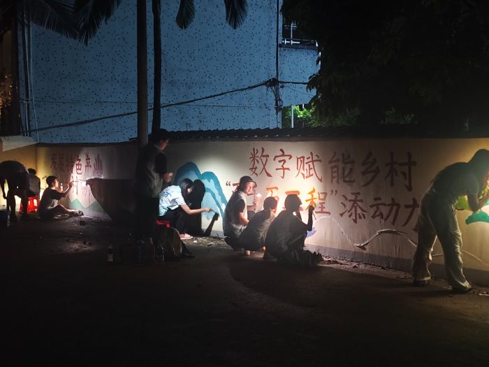 为追回被天气耽误的进度,夜晚的村庄里,手电与手机闪光灯的光束照亮墙面,队员们加班加点继续创作。被汗水浸透的队服、沾满颜料的双手、夜晚亮起的灯光,共同见证着他们的坚守,成为青春最鲜明的印记。
