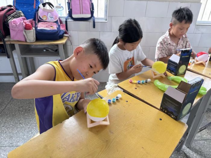 告别纪念馆,服务队转身走进乡镇小学,为三年级孩子打造“情绪魔法课堂”。借助趣味情景剧、情绪卡片游戏,队员们把情绪识别、调节技巧变成互动体验,让孩子们在欢笑中掌握情绪管理“密钥” 。课堂尾声,“小月亮手作”环节温馨开启,孩子们用颜料与创意绘制专属作品,在艺术创作里释放童真、疏解压力,让积极心态伴随成长。